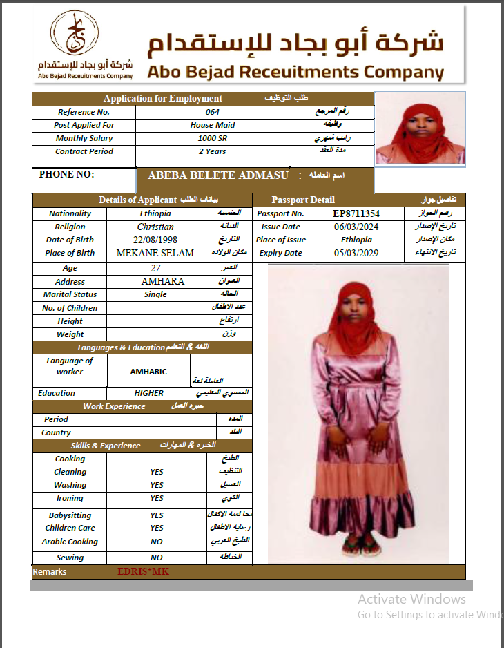 الجنسية : إثيوبيا