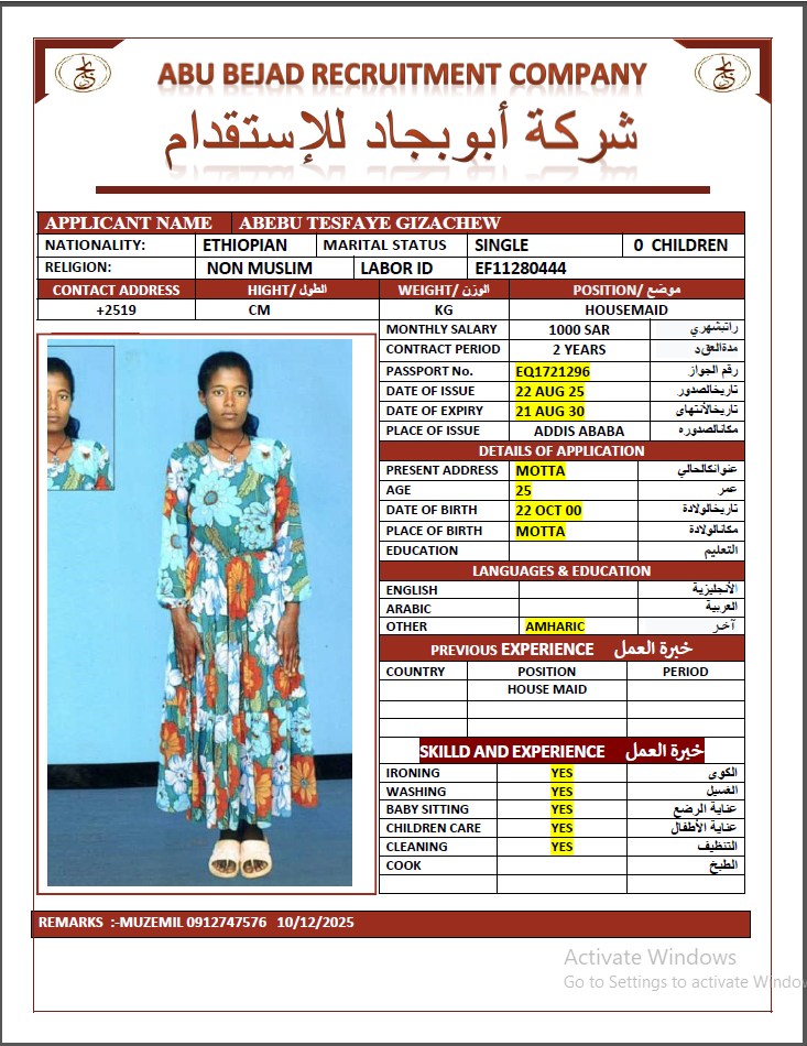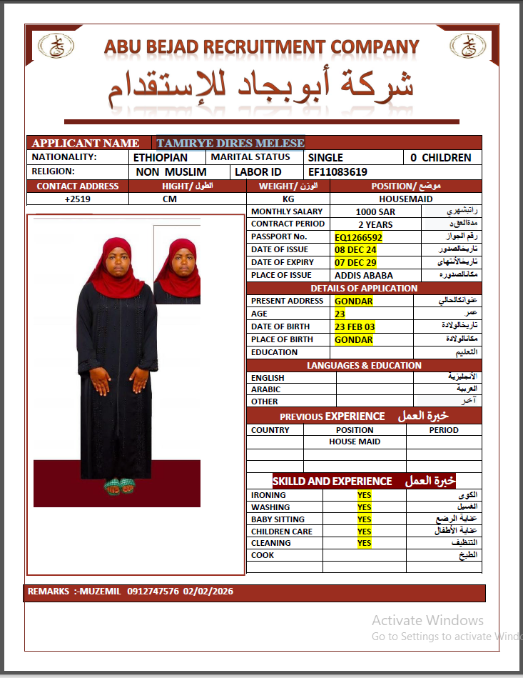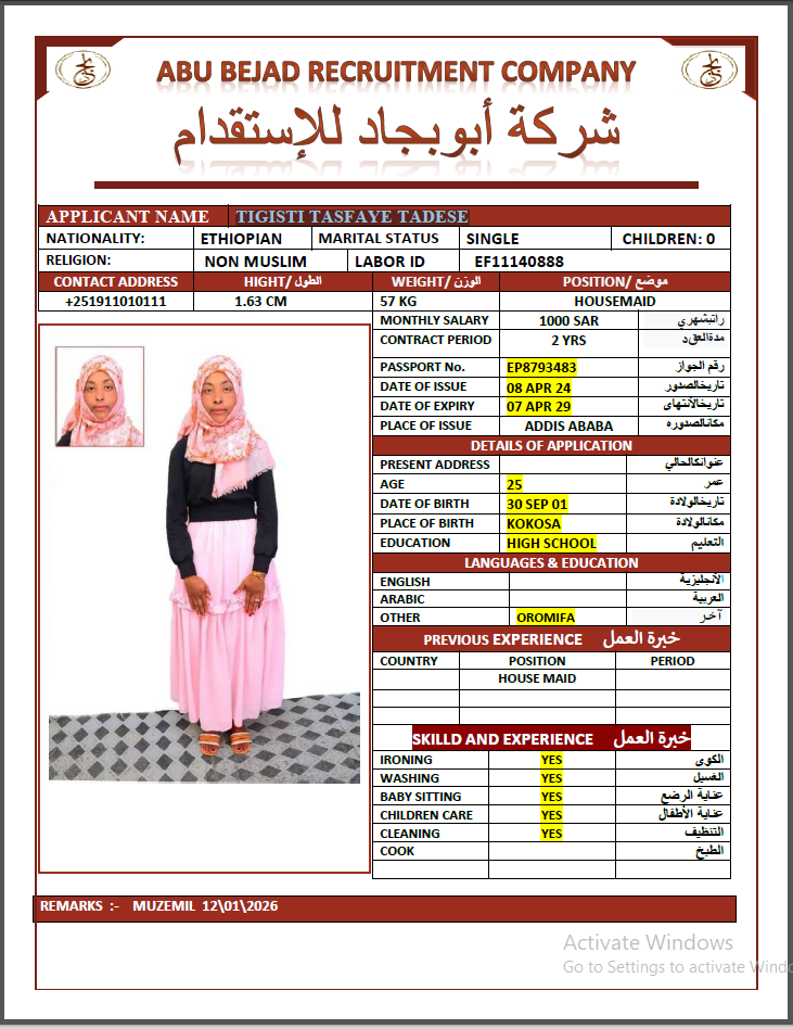 المهنة : عاملة منزلية