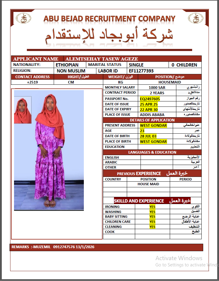 الجنسية : إثيوبيا