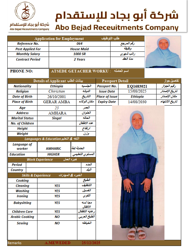 الجنسية : إثيوبيا