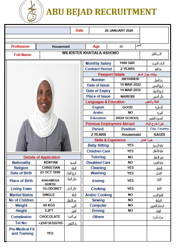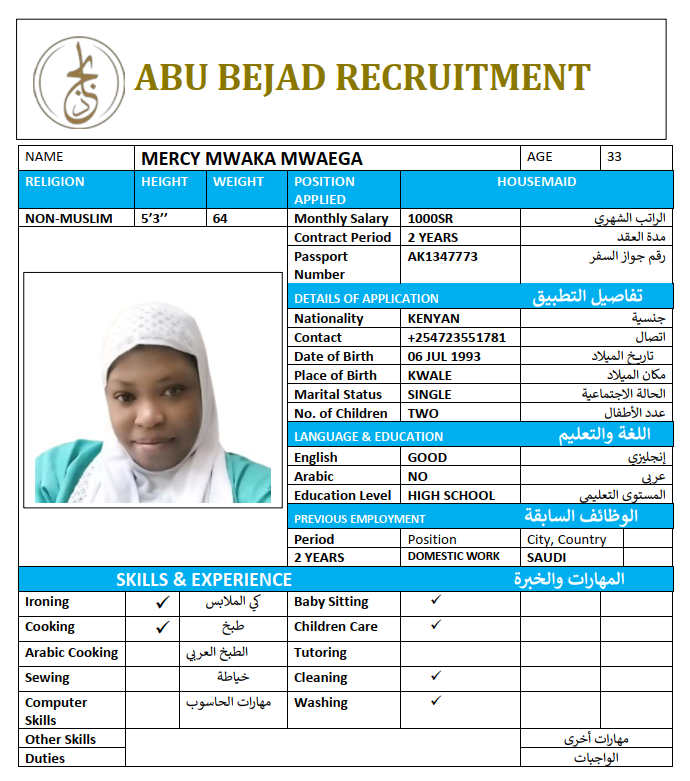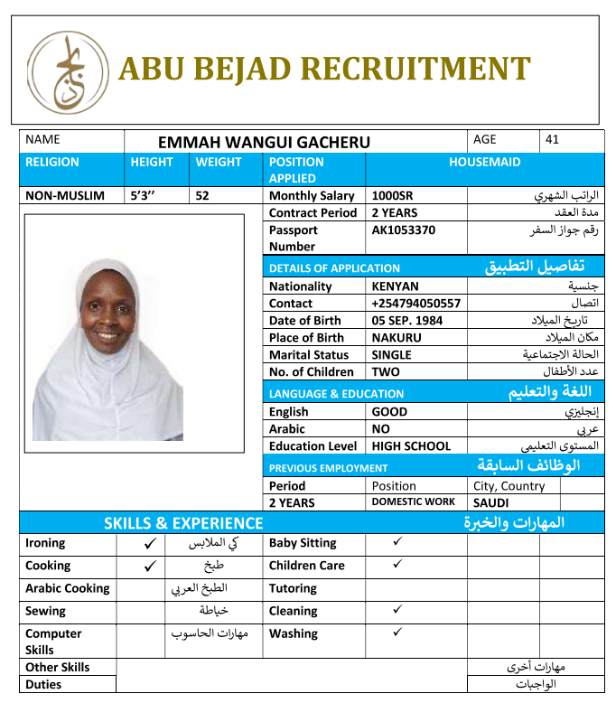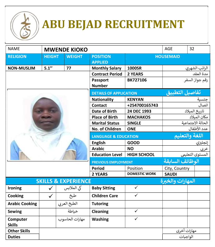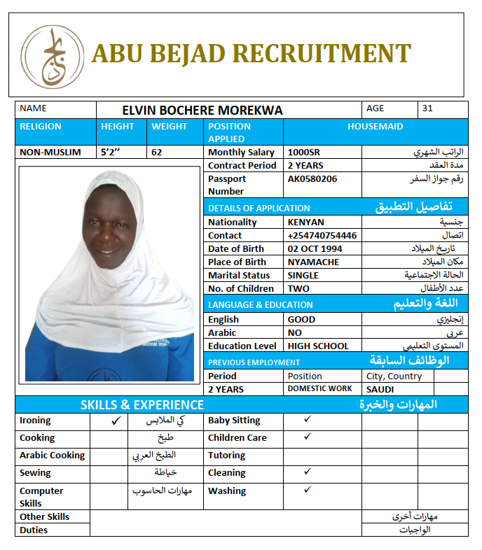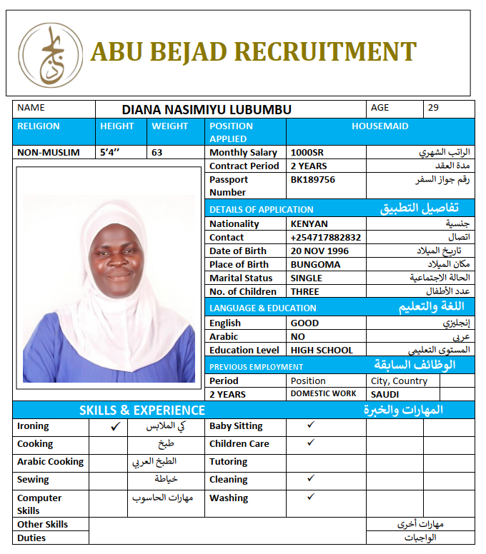 المهنة : عاملة منزلية