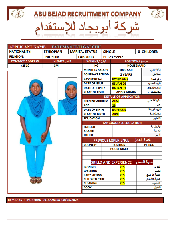 الجنسية : إثيوبيا