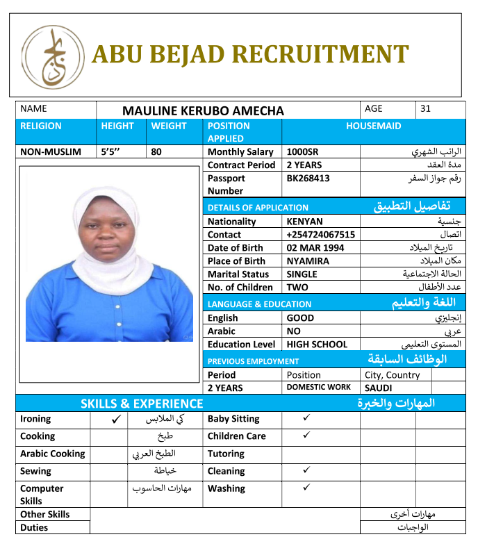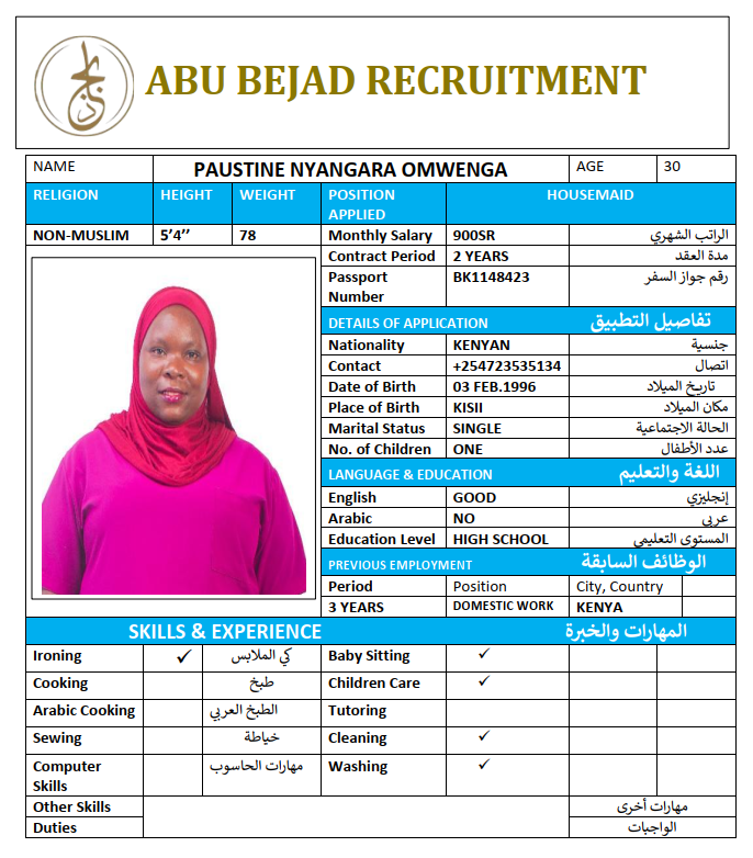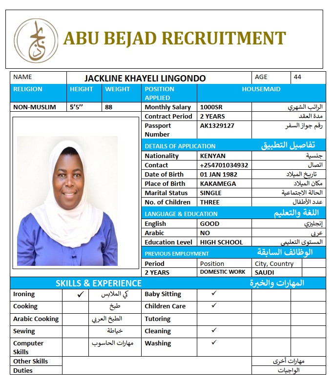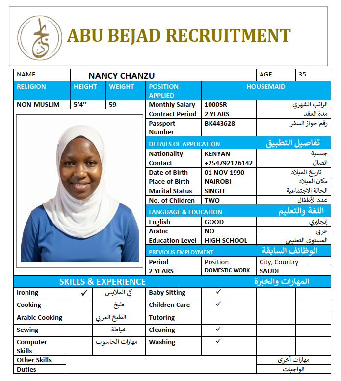 المهنة : عاملة منزلية