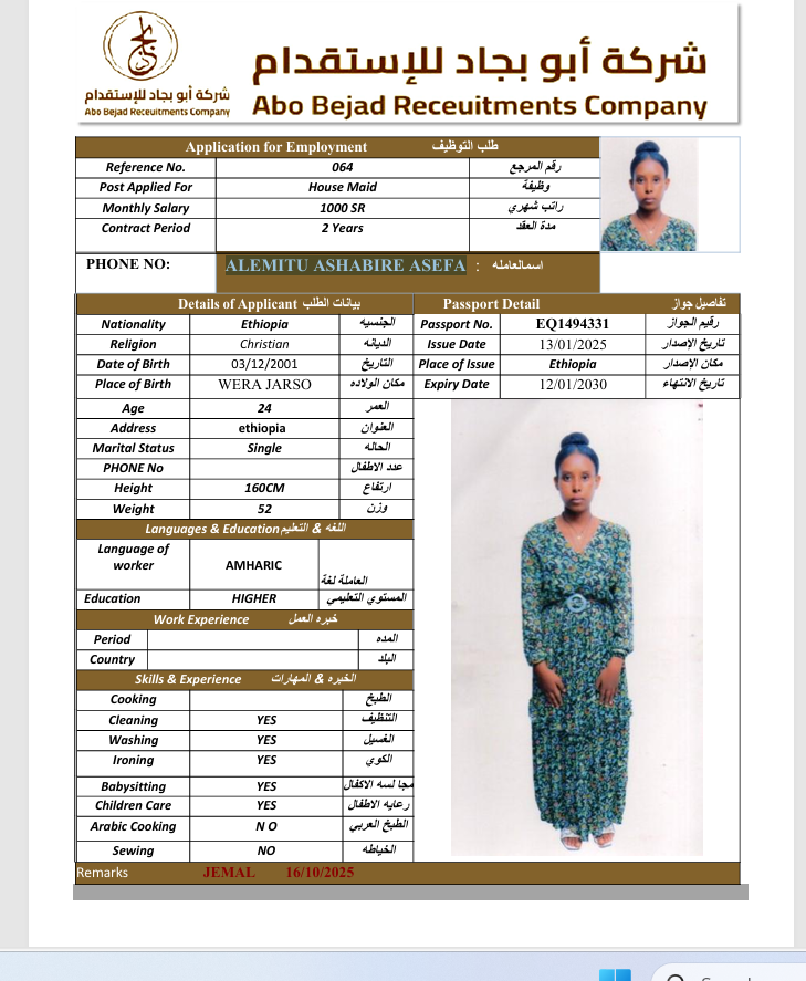 المهنة : عاملة منزلية
