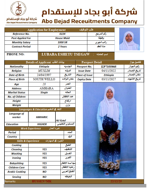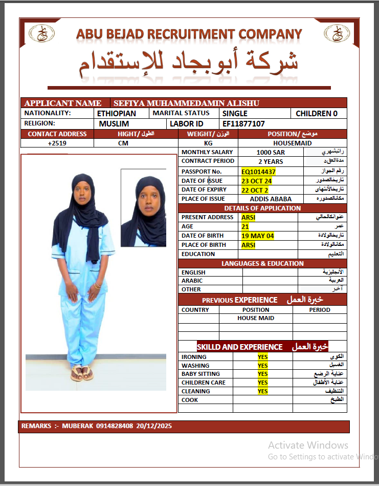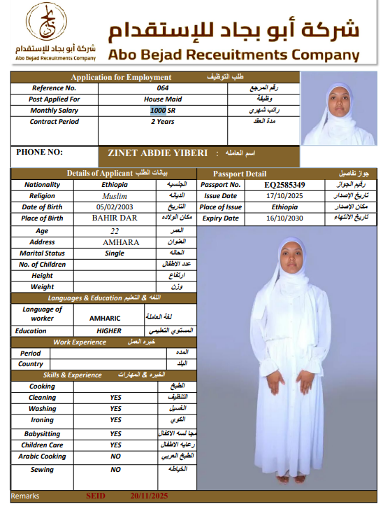 الجنسية : إثيوبيا