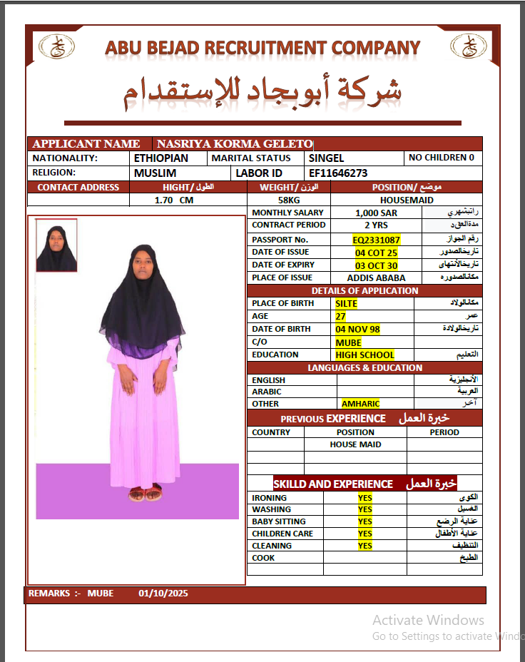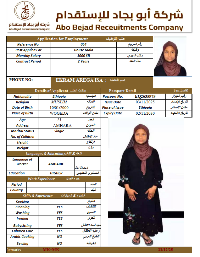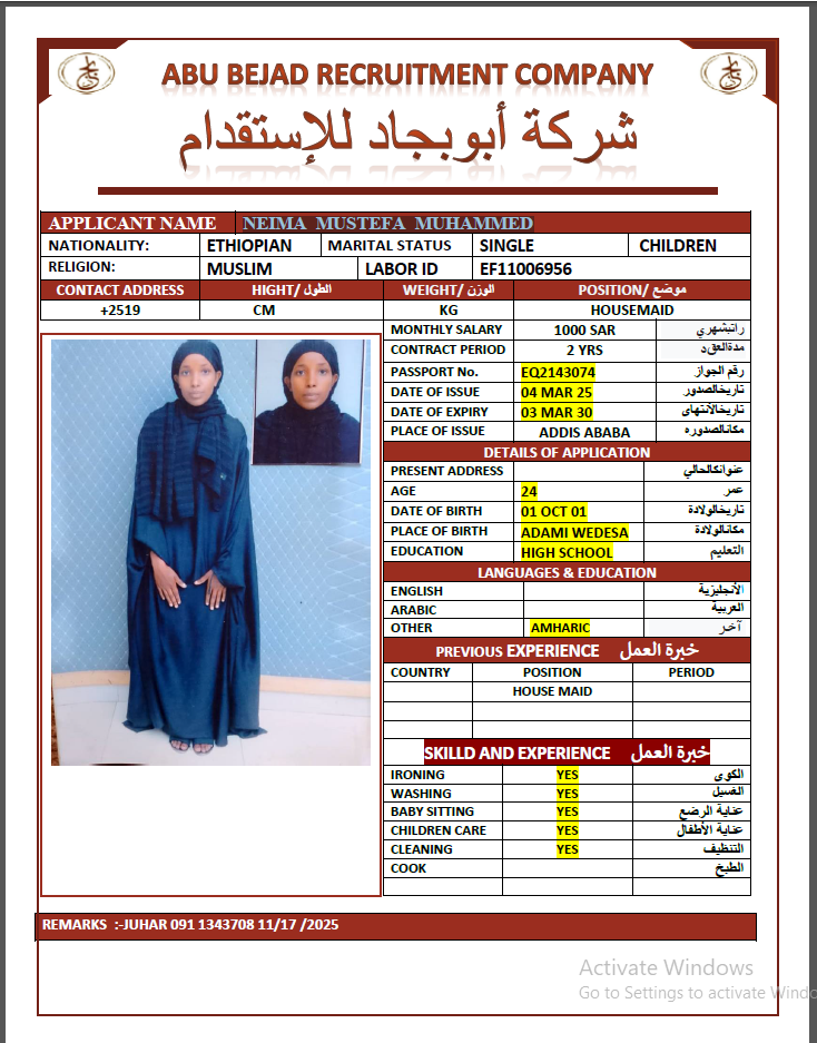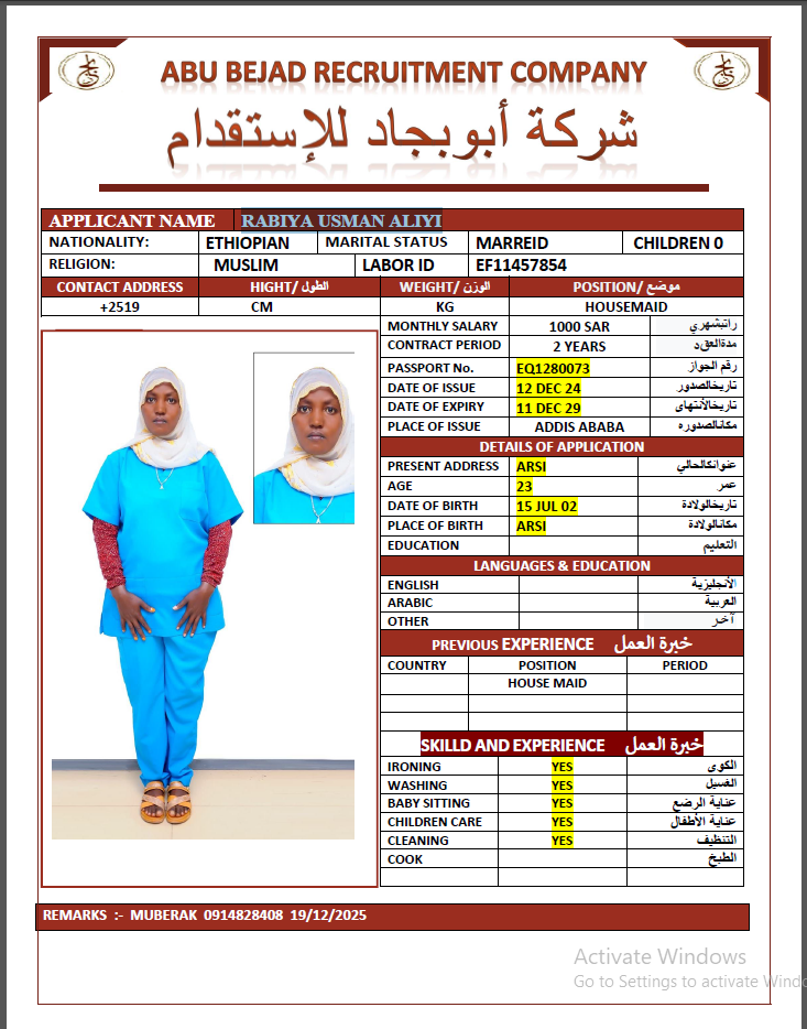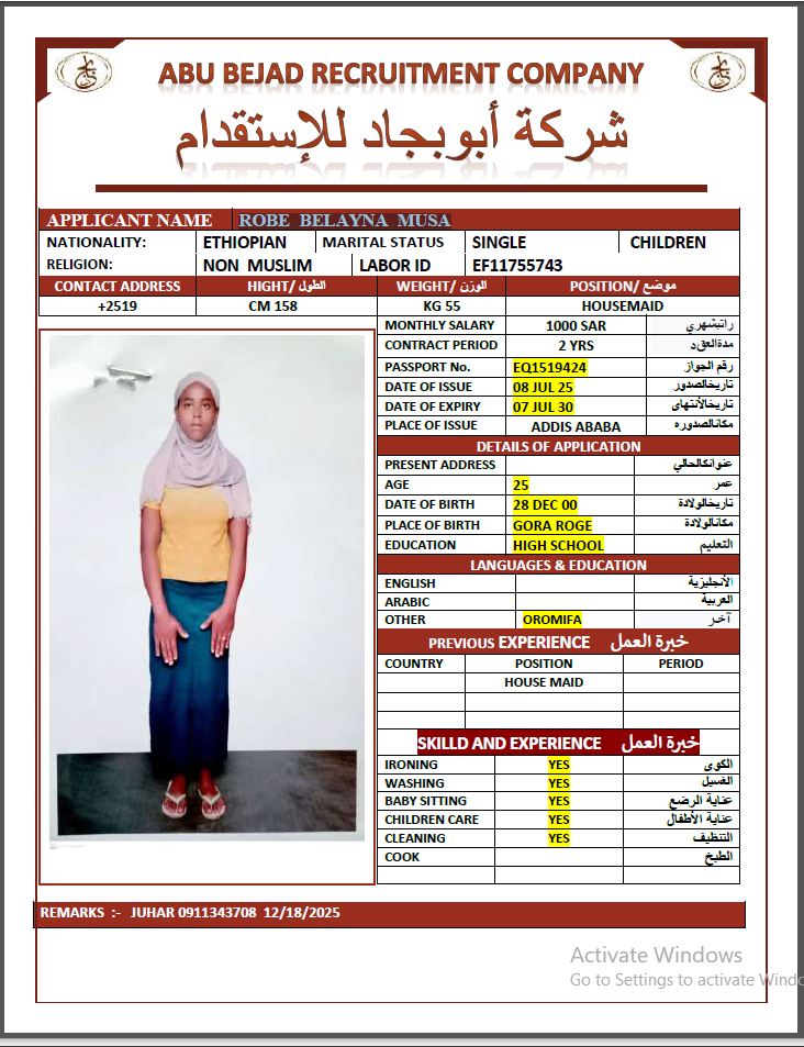 المهنة : عاملة منزلية